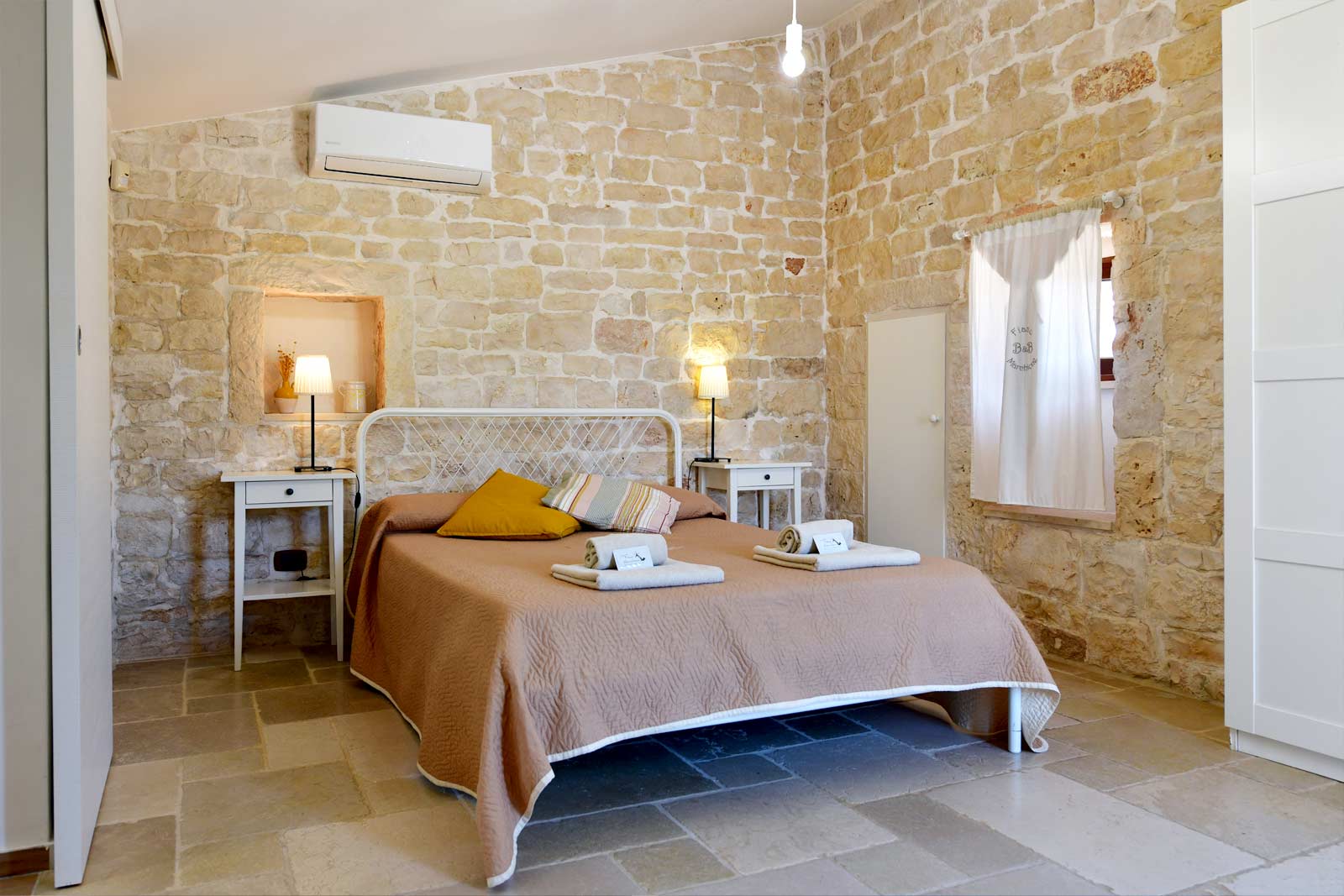 La nostra camera matrimoniale è un rifugio di tranquillità a Castellana Grotte, pensato per due ospiti che desiderano godere di ogni attimo in autentico relax. Qui il comfort si sposa con il fascino dello stile rustico pugliese: le pareti chiare e gli arredi di raffinata essenzialità creano un ambiente accogliente, illuminato dalla luce naturale che filtra dalle finestre.